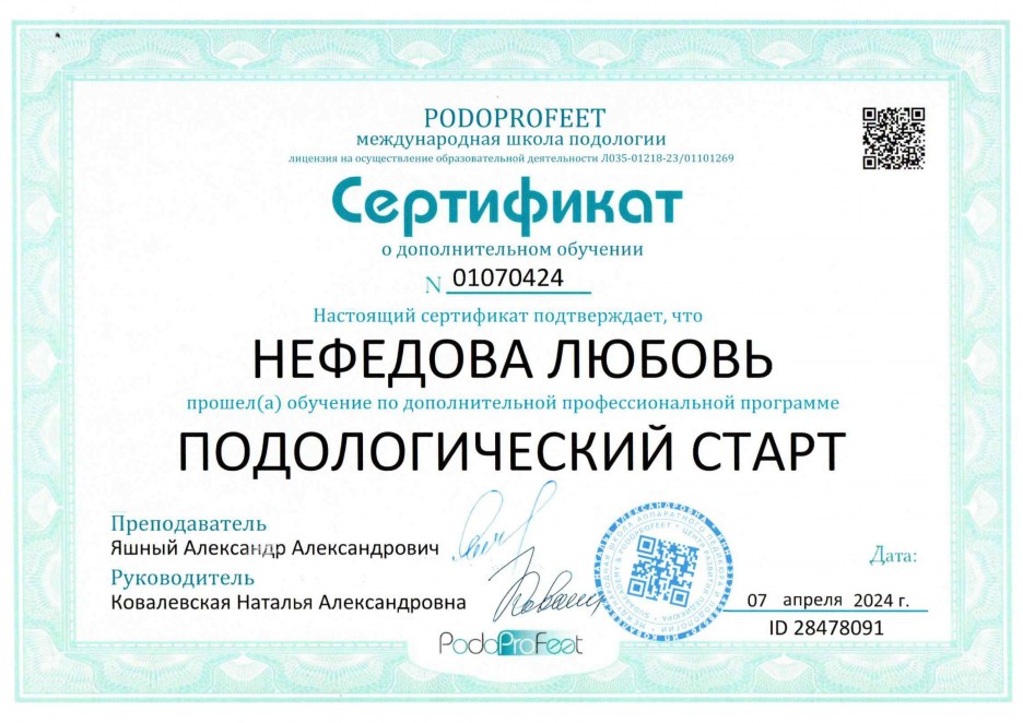 В апреле 2024 года прошла обучение «Подологический старт», Н.А. Ковалевская, Международная школа подологии «Podoprofeet».